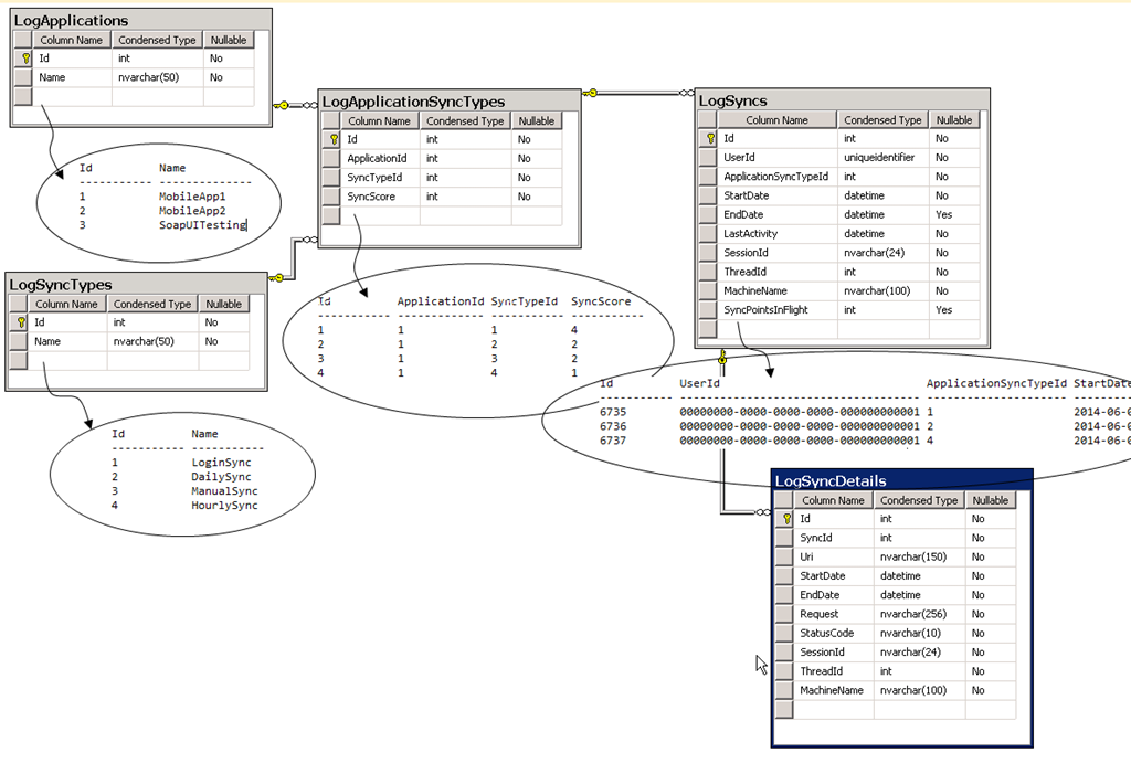 Looking at the below table design you might also notice there is field on the ‘LogSyncs’ called ‘SyncPointsInFlight’ this is done to be able to better the support the system so at any point in time we can understand what load the system might have been under from a synchronisation perspective for the apps that enlist in the process .
