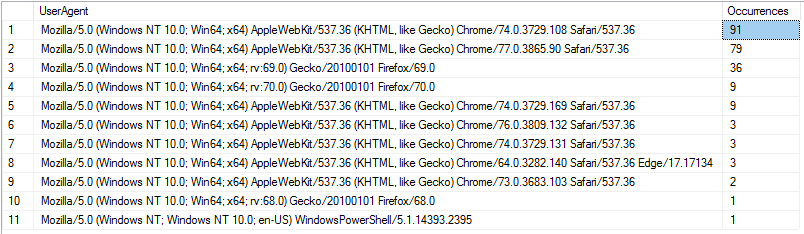 SELECT UserAgent, COUNT(*) AS Occurrences